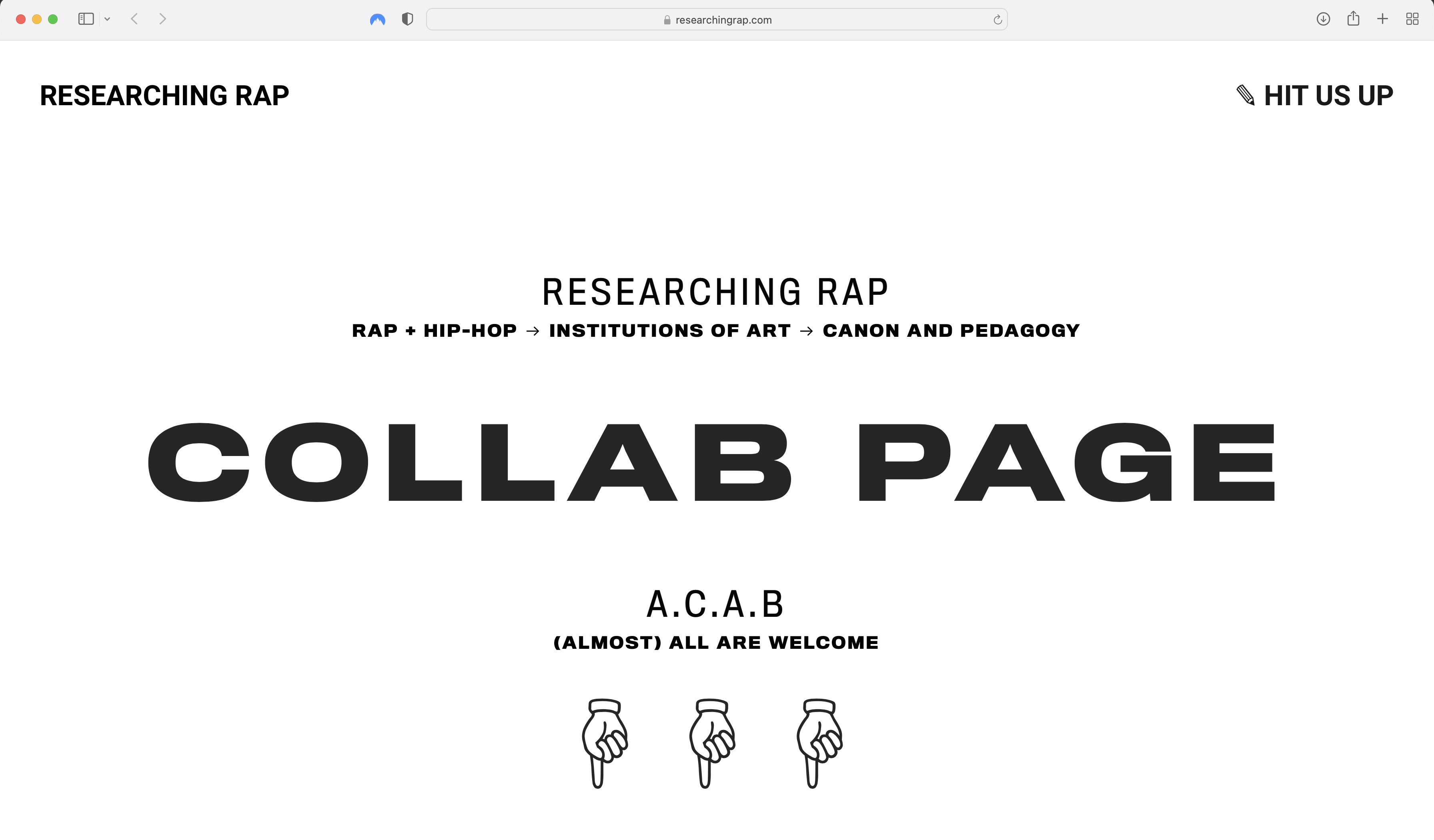 Reserching Rap is a web and print project investigating the ongoing relationship between Institutions of Art, Education, and Design, and Rap and Hip-Hop Musicians.